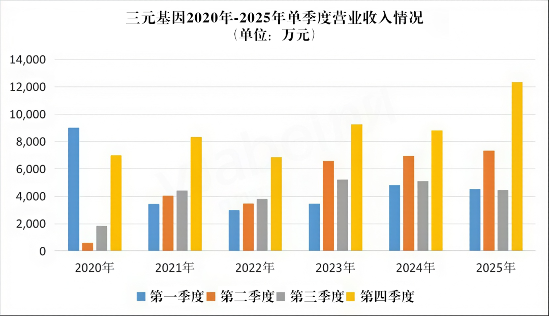 2025年第四季度,三元基因營業(yè)收入規(guī)模為1.23億元,環(huán)比增速達(dá)到176%,同比也提升了40%。拉長時(shí)間周期來看,公司去年四季度營收是自2020年公布季度數(shù)據(jù)以來的最好水平,首次實(shí)現(xiàn)單季營收突破億元大關(guān)。