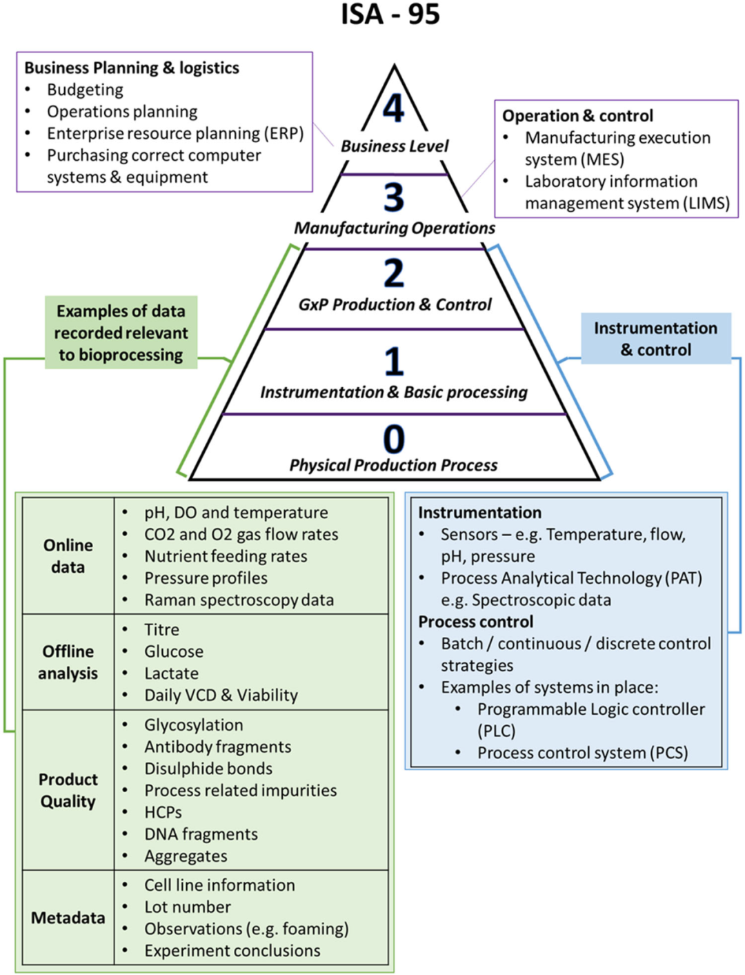 計(jì)算機(jī)化系統(tǒng)由控制系統(tǒng)(即硬件、軟件和固件)和網(wǎng)絡(luò)組件組成,其有助于控制過程,例如創(chuàng)建、修改和共享數(shù)字信息。控制系統(tǒng)國(guó)際標(biāo)準(zhǔn)(ISA-95) 旨在定義生產(chǎn)控制功能和其它企業(yè)功能之間交換的電子信息。圖 2通過疊加 GxP 生物工藝數(shù)據(jù)(即 GLP、GMP和 GDP,其中 x = 分別為實(shí)驗(yàn)室、生產(chǎn)和文檔)和用于監(jiān)測(cè)和控制生物反應(yīng)器的儀器的當(dāng)前示例來說明ISA-95 級(jí)別。0 級(jí)描述了生產(chǎn)環(huán)境中的物理生產(chǎn)過程。1 級(jí)記錄來自傳感器或PAT 工具等儀器的過程數(shù)據(jù)。這些儀器在生物工藝中捕獲的典型數(shù)據(jù)包括在線(例如,pH或拉曼)、離線(例如,滴度)、產(chǎn)品質(zhì)量(例如,聚體)和元數(shù)據(jù)(例如,批號(hào))。記錄的數(shù)據(jù)輸入到第 2級(jí)中看到的實(shí)時(shí)過程監(jiān)測(cè)和控制。這輸入到關(guān)于運(yùn)營(yíng)生產(chǎn)的第 3級(jí),例如使用生產(chǎn)執(zhí)行系統(tǒng) (MES)。最后,業(yè)務(wù)計(jì)劃級(jí)別(第 4 級(jí))概述了可用資金以及系統(tǒng)和設(shè)備的管理,這些系統(tǒng)和設(shè)備旨在在設(shè)定的時(shí)間范圍內(nèi)為患者生產(chǎn)高質(zhì)量的產(chǎn)品。