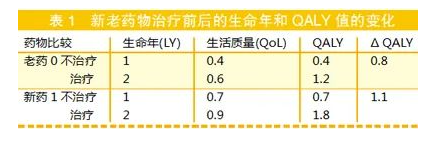 效果可用延長(zhǎng)生命年(life year gains,LY),或者經(jīng)過生活質(zhì)量和藥物產(chǎn)生副作用調(diào)整后獲得的效用值相乘獲得的生命質(zhì)量調(diào)整生命年(QALY)表示,最后計(jì)算出每延長(zhǎng)一個(gè)生命質(zhì)量調(diào)整年的成本(cost per QALY)。