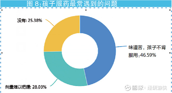 除了劑量難把握,46.59%的家長表示“味道苦,孩子不肯服用”是最大難題(見圖8)。兒童排斥服用、哭鬧、掙扎,都可能影響服藥劑量的準(zhǔn)確性,為了讓孩子順利服藥,很多家長曾采取強(qiáng)迫、哄騙甚至是將藥物溶于牛奶、糖水等液體中給孩子服用。殊不知,這樣做會影響藥物的療效。