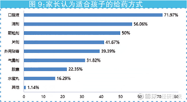 什么劑型是最受家長歡迎的呢?調(diào)查顯示,71.97%的家長會選擇口服液,其次是滴劑和顆粒劑(見圖9)。這說明,兒童藥的易服用性(如藥物的口感和劑型)是家長非常重視的一點(diǎn)。很多兒童對藥物的味道特別敏感,藥物的不良口味會影響其服藥的順應(yīng)性和依從性,從而對藥物的安全性和有效性產(chǎn)生影響。這就意味著,兒童藥劑量和味道的設(shè)計不可或缺,藥企需要從更多維度升級產(chǎn)品質(zhì)量和體驗(yàn),如生產(chǎn)更多便于分裝和使用的劑型,提供適合兒童使用的規(guī)格(如微型片劑)等。